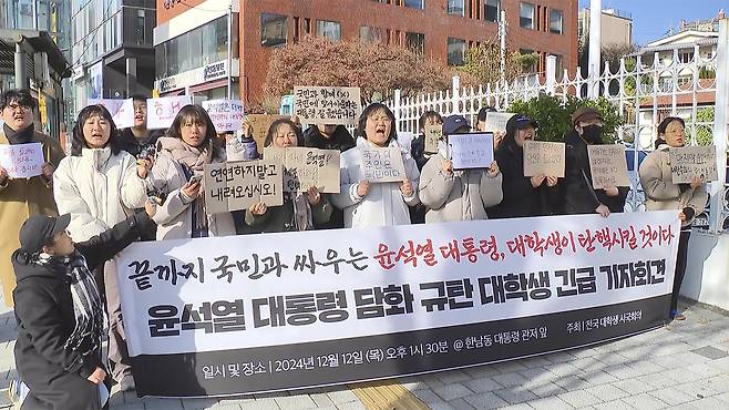 '윤석열 퇴진 대학생 시국 회의'는 오늘 오후 서울 한남동 대통령 관저 앞에서 기자회견을 열고 "계엄 선포의 책임을 회피하고 국민과 싸우겠다는 윤 대통령의 권력은 오늘로써 완전히 끝났다"고 밝혔습니다.