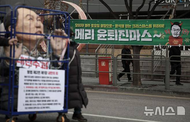 [서울=뉴시스] 정병혁 기자 = 12일 서울 중구 세종대로에서 열린 '내란주범 윤석열 즉각 탄핵, 구속 내란동조 국민의힘 해체' 노동자 시민대회를 마친 민주노총 조합원을 비롯한 참가자들이 대통령실 방향으로 행진하고 있다. 2024.12.12. jhope@newsis.com
