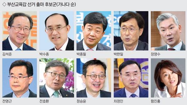 이에 더해 박한일 전 국립한국해양대 총장, 전호환 동명대 총장, 장영수 전 국립부경대 총장도 거론된다. 정승윤 국민권익위원회 부위원장과 김석준 전 교육감 시절 교육국장을 지낸 전영근 씨도 출마를 검토 중인 것으로 알려졌다.