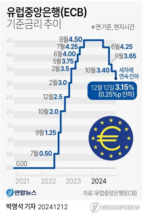 ECB는 12일(현지시간) 독일 프랑크푸르트에서 올해 마지막 통화정책이사회를 열어 예금금리를 연 3.25%에서 3.00%로, 기준금리를 연 3.40%에서 3.15%로 각각 0.25%포인트 내렸다고 밝혔다.