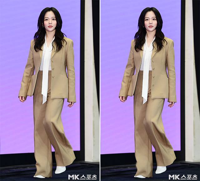 이날 제작발표회에서 정지소는 화이트 블라우스에 베이지 계열의 수트 셋업 패션으로 무대에 올라 포토타임을 가졌습니다.