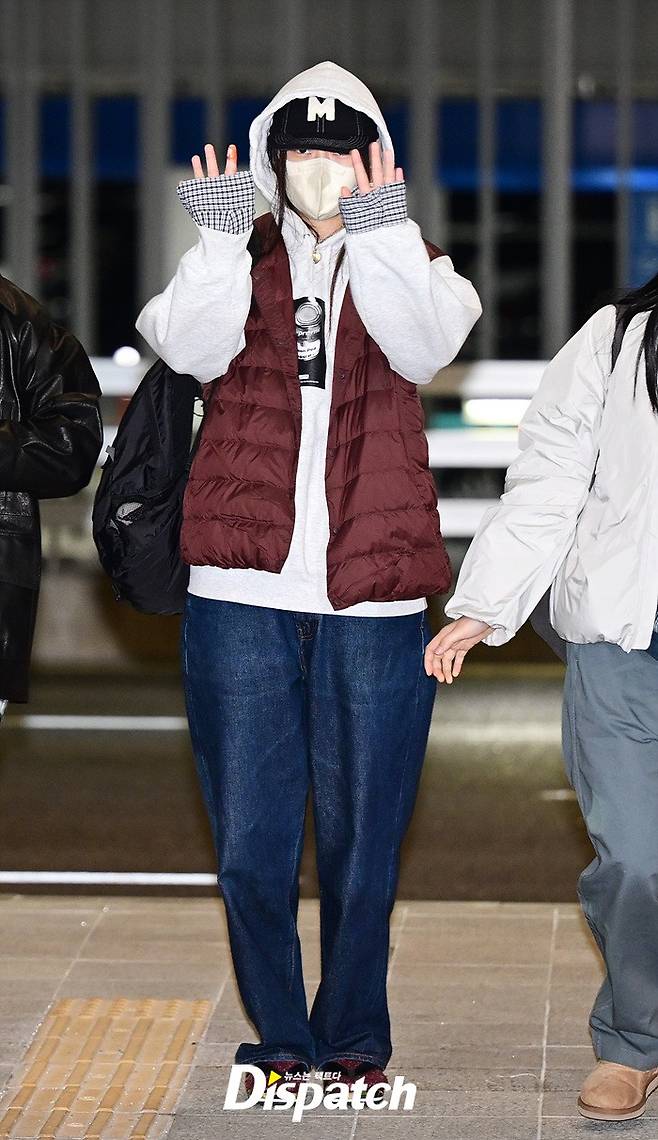 혜인은 마스크에도 똘망똘망한 눈망울로 팬들을 응시했다. 이른 아침 공항에 모인 팬들을 위해 손인사로 화답했다.