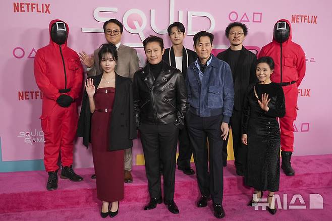 [로스앤젤레스=AP/뉴시스] 오징어 게임 시즌2 출연진이 12일(현지시각) 미 캘리포니아주 로스앤젤레스의 시티 칼리지에서 열린 '오징어 게임' 시즌 2 시사회장에 도착해 기념 촬영하고 있다. 뒷줄 왼쪽부터 시계방향으로 배우 이서환, 임시완, 양동근, 강애심, 이정재 이병헌, 조유리. 2024.12.13.