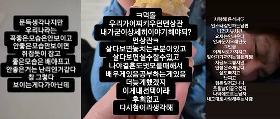 끝으로 남편 사진을 게재하며 "사랑해 은석씨♡인스타 잘 안 하는 남편 나의 자유시간"이라며 "요새는 안 싸우는데 안 싸운 지 오래된 듯 그만큼 이제 서로가 지치고 알아가기까지는 힘든 과정. 지금도 그렇지만 인생은 숙제 같다. 살도 빠지고 난 찌고 힘든 일 겪고 나니 웃을 날이 오겠지 나밖에 모르는 남자 내 그대로 사랑해 주는 사람"이라고 적었다.
