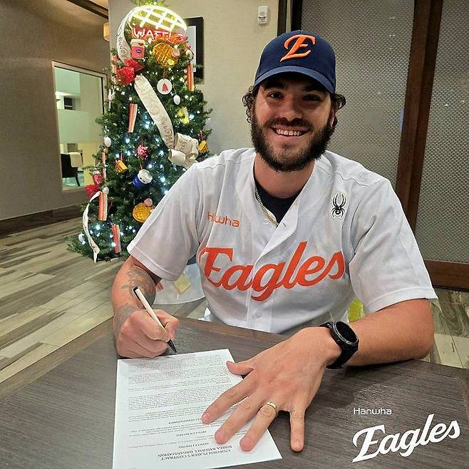 (서울=연합뉴스) 프로야구 한화 이글스가 새 외국인 투수 코디 폰세를 영입했다고 13일 밝혔다. 한화 이글스 새 투수 코디 폰세가 계약서에 서명하고 있다. 2024.12.13 [한화 이글스 제공. 재배포 및 DB 금지]