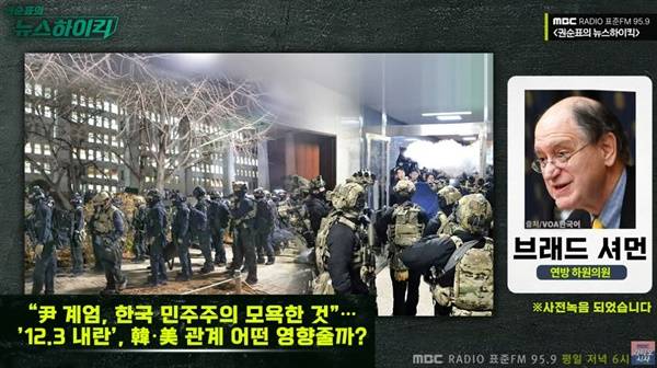 | ▲ 12일 MBC 라디오 '권순표의 뉴스하이킥'와 인터뷰한 브래드 셔먼 미 연방 하원의원은 국군의 북한 타격 시도에 대한 미국의 입장을 묻는 질문에 북한군으로 위장한 국내 소요 사태에 대한 미국의 입장을 밝혔다. |