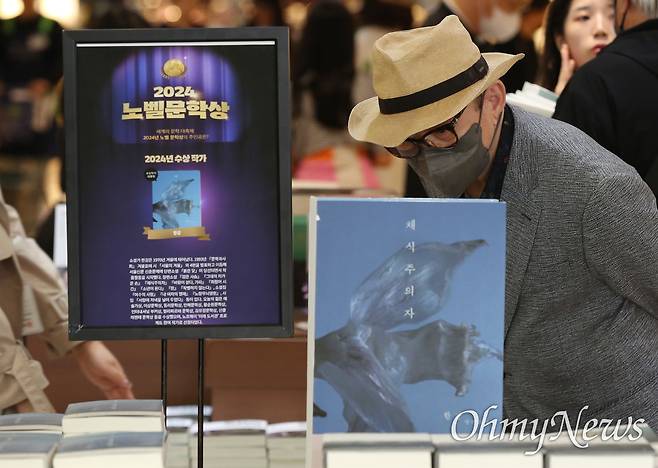 | ▲ 한강 작가, 한국인 최초 노벨문학상 수상 한국인 최초로 노벨문학상을 수상한 한강 작가의 책들이 10월 11일 오전 서울 종로구 교보문고 광화문점에 진열되어 있다. 시민들이 한강 작가의 책들을 살펴보고 있다. |