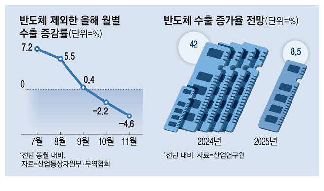 특히 10월과 11월에는 전체 수출이 작년보다 각각 4.6%, 1.4% 늘었지만 반도체를 뺀 수출은 각각 2.2%, 4.6% 감소한 것으로 나타났다. 반도체를 제외한 월간 수출이 전년 동월 대비 두 달 연속 감소한 건 2월과 3월 이후 8개월 만이다.