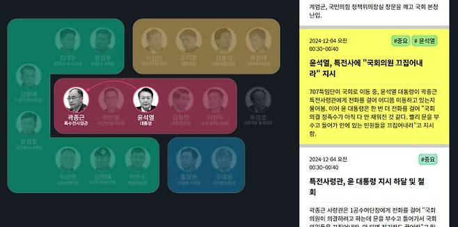 경향신문 데이터저널리즘팀 다이브는 ‘친위 쿠데타’ 혹은 ‘내란’으로 규정되어 가고 있는 12·3 비상계엄 사태의 전조부터 계엄 당일과 이튿날 상황까지, 현재 드러난 모든 정보를 보실 수 있는 인터랙티브 뉴스를 제작했습니다. 향후 국정조사와 특검에서 밝혀낼 정보도 보완할 예정입니다.