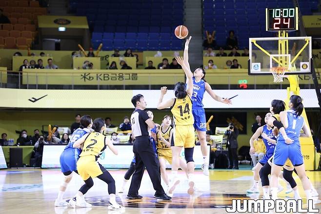 13일 청주체육관에서 열린 하나은행 2024~2025 여자프로농구 정규리그 청주 KB스타즈와 아산 우리은행의 맞대결. 전반전이 종료됐을 때 점수는 23-16으로 우리은행이 근소한 리드를 잡았다.