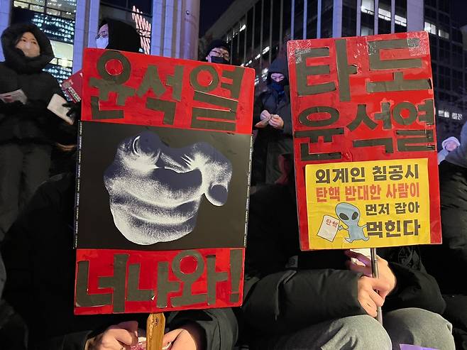 국회의사당역과 여의도역 인근에서 핫팩과 '윤석열 탄핵'이라고 손수 적어 코팅해온 A4 용지, 초콜렛과 사탕을 나눠주는 청년들의 모습도 쉽게 마주칠 수 있었다. 젊은 사람들은 집회 무대 대형 화면에 얼굴이 클로즈업 돼도 얼굴을 가리지 않고 오히려 손으로 'V'자를 그리며 즐거워했다. 국회 주변 카페와 버스 정류장에는 온통 '내란수괴 윤석열 즉각 탄핵', '윤석열 퇴진', '내란동조 국민의힘 해체하라', '페미니스트 이름으로 윤석열을 파면한다', '외계인 침공 시 윤석열 탄핵 반대한 사람부터 먼저 잡아 먹힌다' 같은 손 피켓을 든 청년들로 북적였다.