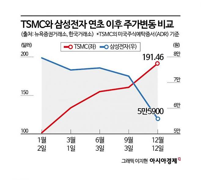 지난해 전체 매출로만 따지면 TSMC는 2조1617억대만달러(약 95조원), 삼성전자는 258조1600억원으로 삼성전자가 2배 이상 많은 상황이지만 연초 이후 삼성전자의 주가가 계속 하락세를 보인 반면, TSMC는 반대로 계속 상승하면서 시총 격차가 크게 벌어졌다. 연초 TSMC ADR의 주가는 101.53달러로 12일 현재 연초대비 88.57%나 급등한 상태다. 반면 연초 7만9600원이었던 삼성전자는 같은기간 29.77% 하락했다.