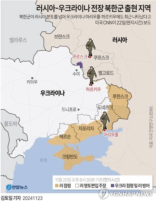 (서울=연합뉴스) 신재우 기자 = 러시아에 파병된 북한군이 우크라이나군 300명을 살해하고 러시아 마을을 탈환했다는 소식을 러시아 군사 블로거들이 일제히 전하고 나섰다고 미국의 북한 전문매체 NK뉴스가 13일(현지시간) 보도했다.