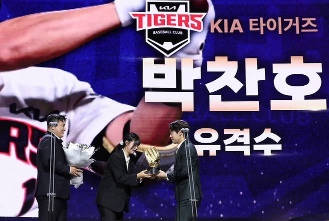 박찬호는 13일 서울 강남구 삼성동 코엑스 오디토리움에서 열린 2024 신한은행 SOL KBO리그 골든글러브 시상식에서 최대 격전지로 손꼽혔던 유격수 부문 골든글러브를 수상했다. 유효표 288표 중 154표(득표율 53.5%)를 얻었다. 경쟁자 박성한(SSG 랜더스)은 118표(득표율 41%)로, 박찬호보다 36표를 덜 받았다.