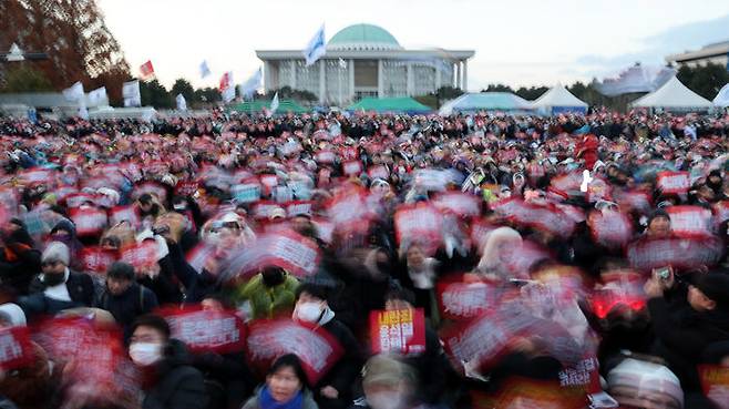▲ 지난 7일 오후 서울 여의도 국회 앞에서 열린 '내란죄 윤석열 퇴진! 국민주권 실현! 사회대개혁! 범국민촛불대행진'에서 참가자들이 탄핵안 표결 처리를 촉구하고 있다.