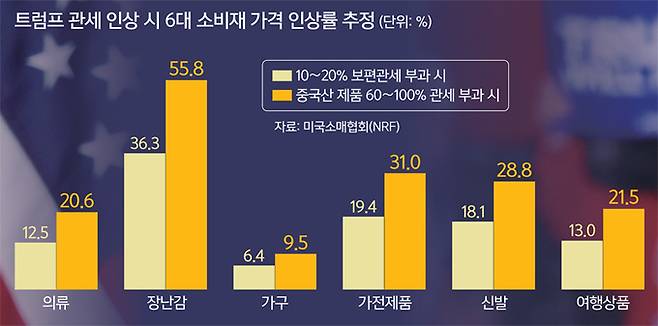 트럼프 당선인의 관세 인상으로 실제 상품 가격이 크게 오를 것이란 전망도 이어지고 있다. 관세 인상에 따라 소매업체가 소비자에게 비용을 전가할 수밖에 없을 것이란 분석이다.
