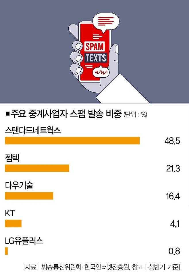 문제는 일감 경쟁이 치열해지다 보니 중계사·재판매사들이 불법 스팸 문자까지 영업해 발송하고 있다는 점입니다. 일례로, 스탠다드네트웍스·젬텍·다우기술 등 3개 중계사가 전체 스팸 신고량에서 차지하는 비중은 무려 86.2%(상반기 기준)에 달합니다. 직접 대량문자 발송 서비스를 하는 KT(4.1%)나 LG유플러스(0.8%) 등 이동통신사도 스팸 문자를 발송하긴 합니다만, 3개 중계사와 비교하면 미미한 수준입니다.