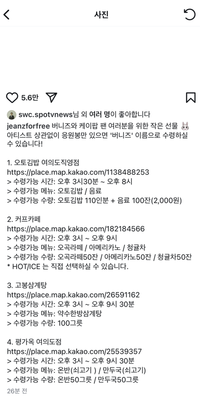 뉴진스는 "팬덤과 상관없이 응원봉만 있으면 누구나 '버니즈' 이름으로 김밥, 음료, 삼계탕, 만두국 등을 무료로 받을 수 있다"고 안내했다. 이들은 여의도 일대의 음식점 4곳에서 오후 3시부터 9시 30분까지 음식 선결제를 완료하며 참가자들이 추운 날씨 속에서도 따뜻한 음식을 즐길 수 있도록 했다.