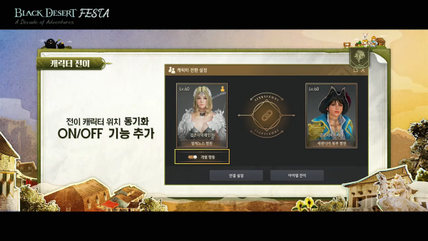 캐릭터 전이는 메인 캐릭터와 대상 캐릭터의 위치가 항상 동기화되어 있어 불편함이 있었다. 전이 캐릭터 위치 동기화 ON/OFF 기능을 추가해 유저가 상황에 따라 직접 설정할 수 있도록 개선한다.