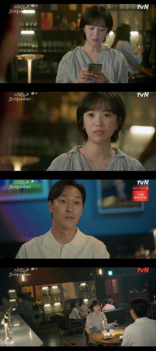 14일 방송된 tvN 토일드라마 ‘사랑은 외나무다리에서’(연출 박준화 배희영/극본 임예진/기획 스튜디오드래곤/제작 스튜디오드래곤 블리츠웨이프로덕션)에서는 맹수아(전혜진 분)와 홍태오(김재철 분)이 한층 가까워지는 모습이 그려졌다.