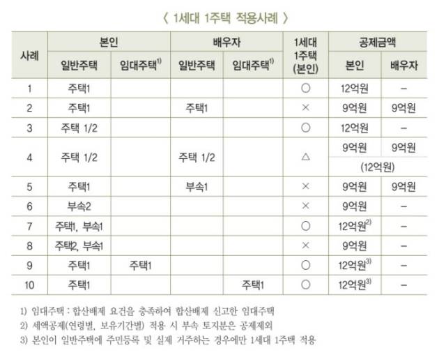 중요한 건 신규 주택과 종전 주택의 소유자가 동일해야 특례가 적용됩니다. 본인이 주택을 보유한 상태에서 배우자 또는 자녀가 신규 주택, 상속주택, 지방 저가 주택을 소유한다면 특례 대상자가 아닙니다. 이런 경우는 2주택 기본 과세로 본인과 세대원이 각각 9억 원만 공제받습니다. 아래는 국세청이 제시한 1세대 1주택 적용 사례 입니다.