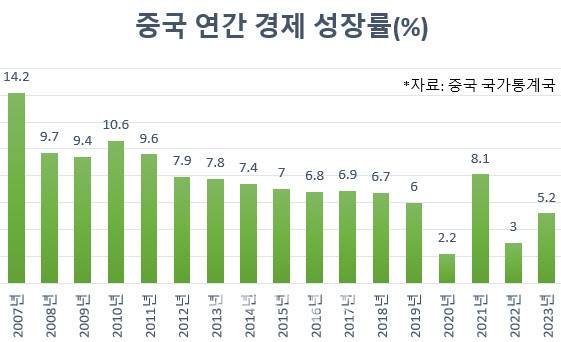 중국의 국내총생산(GDP)은 2000년대까지 두자릿수 성장세였다. 봉쇄 조치 여파가 컸던 2020년(2.2%), 2022년(3.0%)을 제외하면 5% 이하로 내려간 적도 없다. 작년에도 5.2%의 성장률을 기록하며 정부 목표치(약 5%)를 웃돌았다.