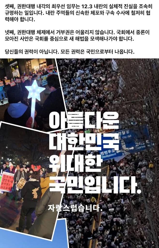 그러면서 "정치적·법률적·도의적 책임에서 자유롭지 못합니다. 한 마디로 온전치 못한 권한대행입니다. 오히려 부끄러운 줄 알아야 합니다. 그 점에서 노무현 전 대통령, 박근혜 전 대통령 탄핵 상황과 차이가 있습니다"라고 덧붙였다.