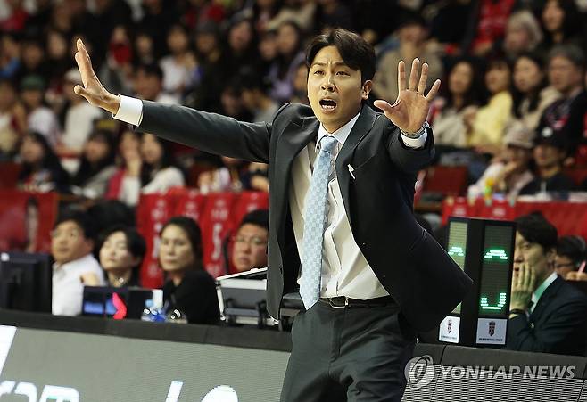 (안양=연합뉴스) 홍기원 기자 = 15일 경기도 안양정관장아레나에서 열린 프로농구 안양 정관장 레드부스터스와 고양 소노 스카이거너스의 경기. 소노 김태술 감독이 작전을 지시하고 있다. 2024.12.15