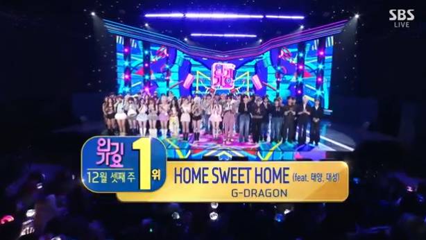 15일 방송된 SBS '인기가요'에서는 지드래곤의 'HOME SWEET HOME'이 트와이스 'Strategy', 로제 'nomber one girl'을 제치고 12월 셋째주 1위에 이름을 올렸다.