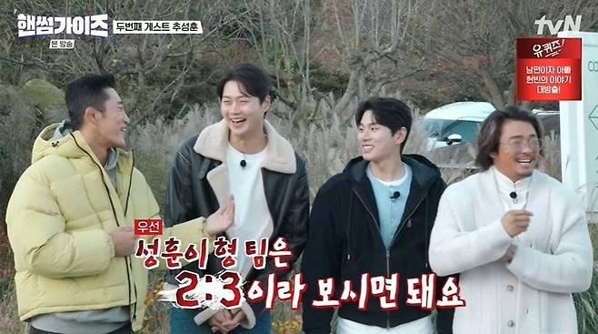 추성훈이 핸썸 팀과 가이즈 팀에 골라야 하는 상황. 김동현은 "형이 설마 핸썸하다고 생각하냐"라고 했지만, 추성훈은 "(오상욱이) 잘생겼고, (동현이도) 격투기 선수 중엔 조금 괜찮다. 나도 아저씨 중에선 괜찮다"라는 논리로 핸썸 팀이 되었다. 핸썸 팀은 먼저 강진으로 향했다.