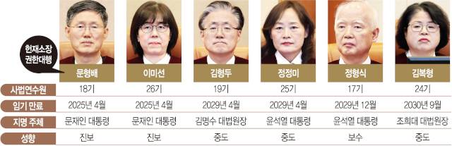 헌재는 재판관 6인 체제로 가동 중이다. 성향 구도는 진보 2명(문형배 이미선), 중도 3명(김형두 정정미 김복형), 보수 1명(정형식)으로 분류된다. 연내 후보자 3명 임명이 완료되면 ‘9인 완전체’ 구도는 진보 4, 중도 3, 보수 2로 재편될 전망이다. 재판관 9명 중 6명 이상이 비상계엄 선포의 위헌·위법성이 중대하다고 보면 파면 결정이 이뤄진다.
