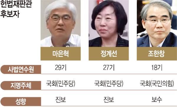 법조계에 따르면 더불어민주당 추천 몫 재판관 후보자인 정계선 서울서부지법원장과 마은혁 서울서부지법 부장판사는 모두 진보 성향으로 분류된다. 국민의힘 추천 몫 조한창 변호사는 보수 성향으로 평가된다. 이번 국회 추천 재판관 후보자들의 경우 권한대행을 맡은 한덕수 국무총리의 형식적 임명권 행사가 가능하다는 게 법조계 해석이다. 박근혜 전 대통령이 탄핵된 후 황교안 권한대행이 대법원장 추천 몫 이선애 전 헌법재판관을 임명한 전례가 있다.