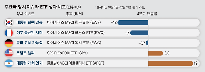 반면 아르헨티나 주요 기업에 투자하는 글로벌X MSCI 아르헨티나 ETF(ARGT)는 같은 기간 19% 급등했다. 올해 연간 기준으로 EWY는 약 14% 하락한 반면 ARGT는 약 70% 뛰었다.