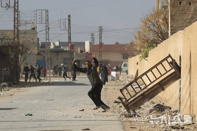 [다마스쿠스=AP/뉴시스] 15일(현지시각) 시리아 다마스쿠스 외곽 후세이니예 마을에서 한 소년이 바샤르 알아사드 정권 시절 군 장교들의 주거 단지를 약탈하던 중 이를 제압하는 반군 전투원들에게 투항하고 있다. 반군 전투원들은 이 지역 주거 단지에 몰려들어 일부 아파트를 방화한 약탈자들을 제압하기 위해 이 마을에 투입됐다. 2024.12.16.