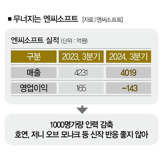 "12년 만의 분기 적자." 2024년 11월. 게임사 엔씨소프트가 충격적인 성적표를 받아들었다. 엔씨는 지난 3분기 매출 4019억원, 영업손실 143억원을 냈다. 매출은 전년 동기 대비 5.0% 줄었고(4231억원→4019억원), 영업이익은 186.5% 감소했다(165억원→ -143 억원).