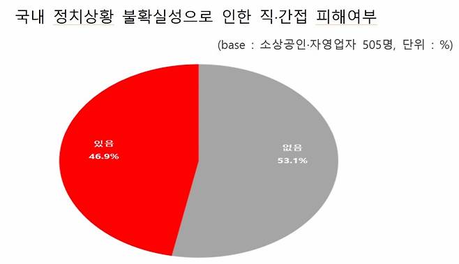 16일 중소기업중앙회는 불안정한 국내 경제상황과 관련 소상공인·자영업자의 피해 현황을 파악하기 위해 긴급실태 조사를 실시한 결과 46.9%이 피해를 입었다고 밝혔다.