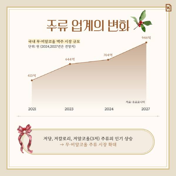 이 같은 흐름에 주류 업계도 관련 제품을 출시하고 있다. 저당, 저칼로리, 저알코올 주류가 인기를 얻으면서 다양한 관련 주류를 개발·판매하고 있다. 시장조사기업인 유로모니터에 따르면 국내 무·저알코올 맥주 시장 규모는 지난 2021년 415억에서 지난해 644억 원으로 55.2% 성장했다. 3년 뒤인 2027년에는 1000억 원대에 육박할 것으로 전망했다.