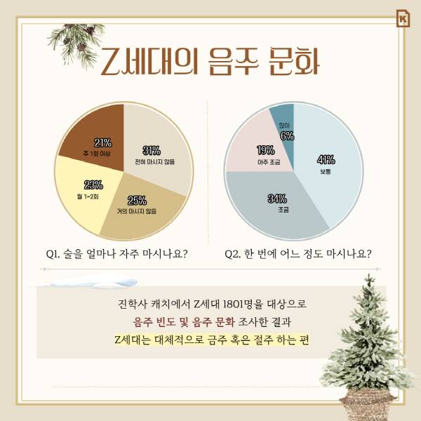 진학사 캐치에서 Z세대 1801명을 대상으로 실시한 음주 빈도 조사에 따르면 ‘전혀 마시지 않는다’, ‘거의 마시지 않는다’는 응답이 과반수를 넘겼고, ‘월 1~2회 마신다’가 23%로 뒤를 이었다. 술을 어느 정도 마시냐는 질문에는 ‘보통’(취했지만 의식이 또렷한 상태)으로 마신다는 응답이 41%로 가장 많았다. ‘조금’(살짝 취기가 오른 상태)이 34%로 그 뒤를 이었다.