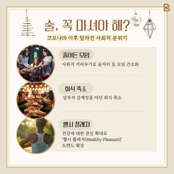 연말에 다양한 모임을 계획하고 있다는 강지연(27)씨는 “지인들과 술자리가 있긴 하지만 취할 정도로 마시지는 않을 생각이다. 집에 친구들을 초대하기로 했는데 그 때는 무알코올 맥주만 마실 것”이라며 “다음 날 숙취로 고생하기 싫은 것도 있지만 마시면서 건강을 해치고 있다는 생각이 강하게 든다”고 말했다.