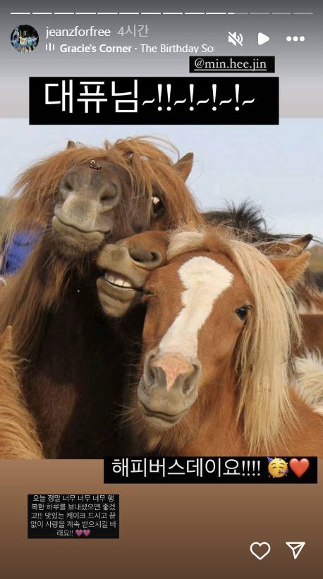 그리고 뉴진스는 민 전 대표와 여전히 끈끈한 관계를 보여줬다. 다니엘은 자신이 어린 시절 생일 축하 노래를 부르는 영상과 함께 '대퓨님 해피버스데이'라고 민 전 대표의 생일을 축하했다. 다른 멤버들도 "오늘 정말 너무너무너무 행복한 하루를 보내셨으면 좋겠고 맛있는 케이크 드시고 끝없이 사랑을 계속 받으시길 바라요"라고 메시지를 남겼다. 이에 민 전 대표는 '좋아요'로 화답했다.