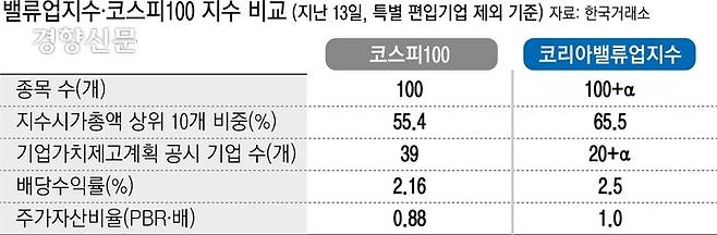 밸류업지수는 배당수익률과 자사주 매입·소각률 등 주주환원의 수준보다는 실시 여부로 평가한다. 2년 연속 배당을 실시하는 기업 가운데 특정 섹터별로 주가순자산비율(PBR)과 자기자본이익률(ROE)이 높은 기업이 지수에 이름을 올린다. 그렇다보니 주주가치 제고를 지향하는 밸류업지수에서 주주가치가 우수한 기업들은 정작 지수에서 제외되는 문제가 생겼다. 실제로 지난 13일 기준 코스피100지수와 밸류업지수의 배당수익률은 각각 2.16%와 2.5%로 0.34%포인트 차이에 불과했다.