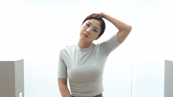 ④ 반대쪽 팔을 아래로 쭉 펴고, 들어 올린 어깨를 쭉 내리면서 근육에 자극을 준다.
