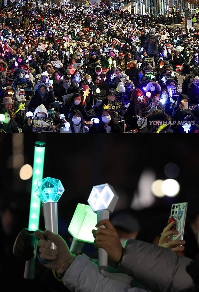 집회에 최적화된 K팝 팬들, 'MAMA in 국회'라고 불릴 만큼 다양한 응원봉을 든 K팝 팬들이 여의도에 모였다. god, 에픽하이, 소녀시대, 아이유, 엑소, 빅뱅, 방탄소년단, NCT, 뉴진스, 라이즈 등 1∼4세대 아이돌 팬들이 모두 모였다.