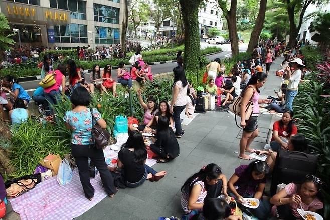 | ▲ 일주일에 하루 쉬는 날이 되면 가사도우미들은 시내 길거리나 공원에 모여 휴식을 취합니다. 사진 출처 HOME(Humanitarian Organization for Migration Economics) |