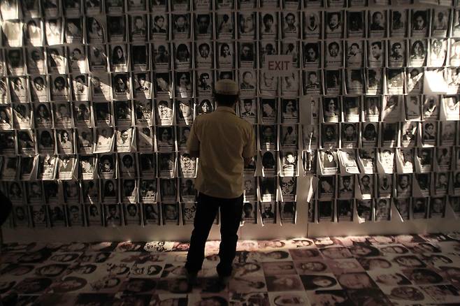 | ▲ 2016년 2월 26일(현지시간) 필리핀 케손시티에 있는 피플 파워 체험 박물관에서 한 방문객이 계엄 희생자들의 사진을 보고 있다. 1972년 페르디난드 마르코스 필리핀 대통령의 계엄 선포부터 1986년 평화 혁명까지 다각도로 체험할 수 있는 이 박물관은 마르코스 독재정권을 무너뜨린 피플 파워 혁명 30주년 기념 행사의 일환으로 만들어졌다. |