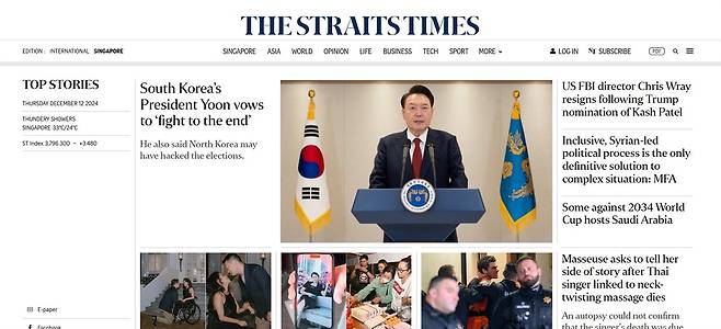 | ▲ "끝까지 싸우겠다"는 윤석열의 말을 머리기사로 보도한 싱가포르 <스트레이츠 타임스> |