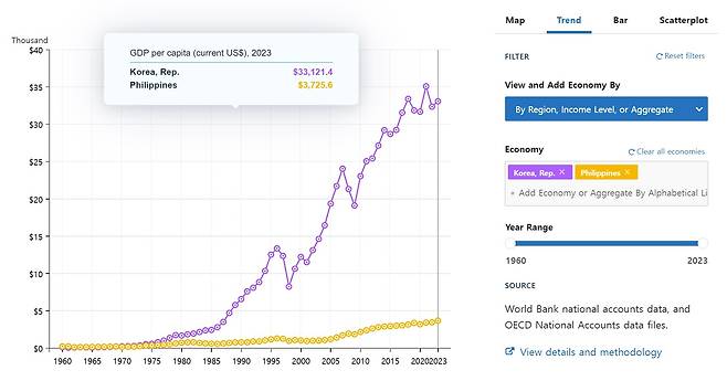 | ▲ 한국과 필리핀의 1인당 국내총생산(GDP) |