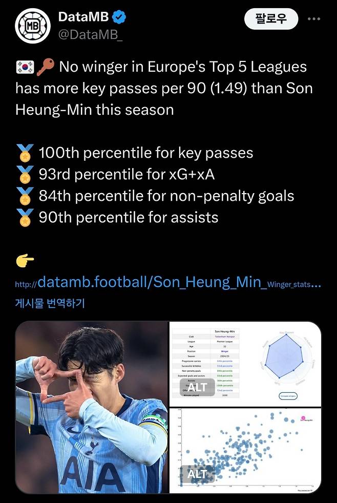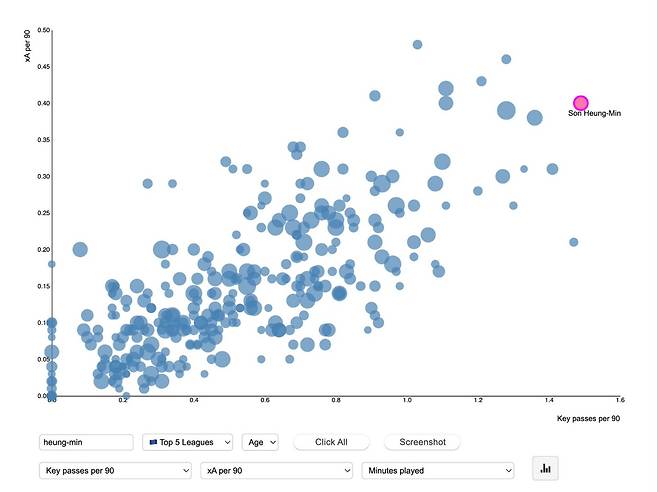 에이징 커브도 최근에 아무 문제가 없다는 점이 확인됐다. 케인은 뮌헨에 온 뒤 손흥민이 뿌려주는 패스가 사라져 이를 몇 차례 그리워했는데 손흥민이 이번 시즌에는 패스 수준이 더욱 성장했음을 알려주는 지표까지 등장했다.