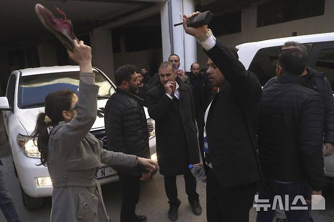 [세이드나야=AP/뉴시스] 16일(현지시각) 시리아 다마스쿠스 북부 세이드나야에 있는 악명 높은 군 교도소에서 실종된 가족을 찾고 있는 한 여성이 이곳을 방문한 예이르 페데르센(가운데) 유엔(UN) 시리아 특사를 향해 신발을 던지려 하고 있다. 2024.12.17.