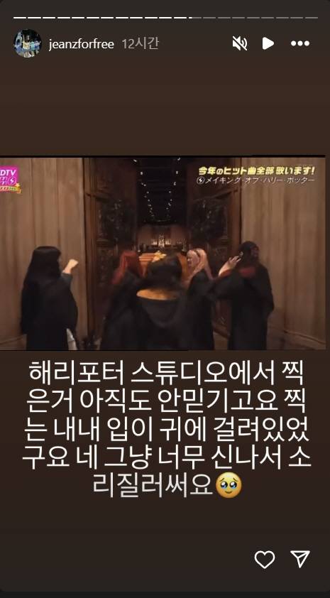뉴진스는 14일 새롭게 개설한 '진즈포프리' 계정에 일본 해리포터 스튜디오에서 찍은 사진을 여러 장 게재했다. 이들은 "해리포트 스튜디오에서 찍은 거 아직도 안 믿기고요. 찍는 내내 입이 귀에 걸려 있었고요. 네 그냥 너무 신나서 소리 질렀어요"라고 소감을 전했다.